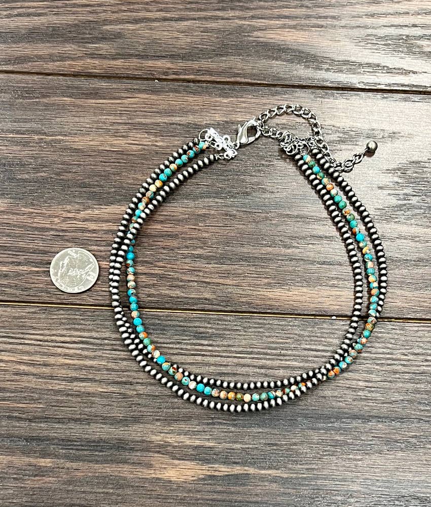 Handmade 3-strand Gemstone & Navajo Bead Necklace. The 3-strands are all 15" long and a 5" extender. 4mm turquoise and 4mm navajo beads.