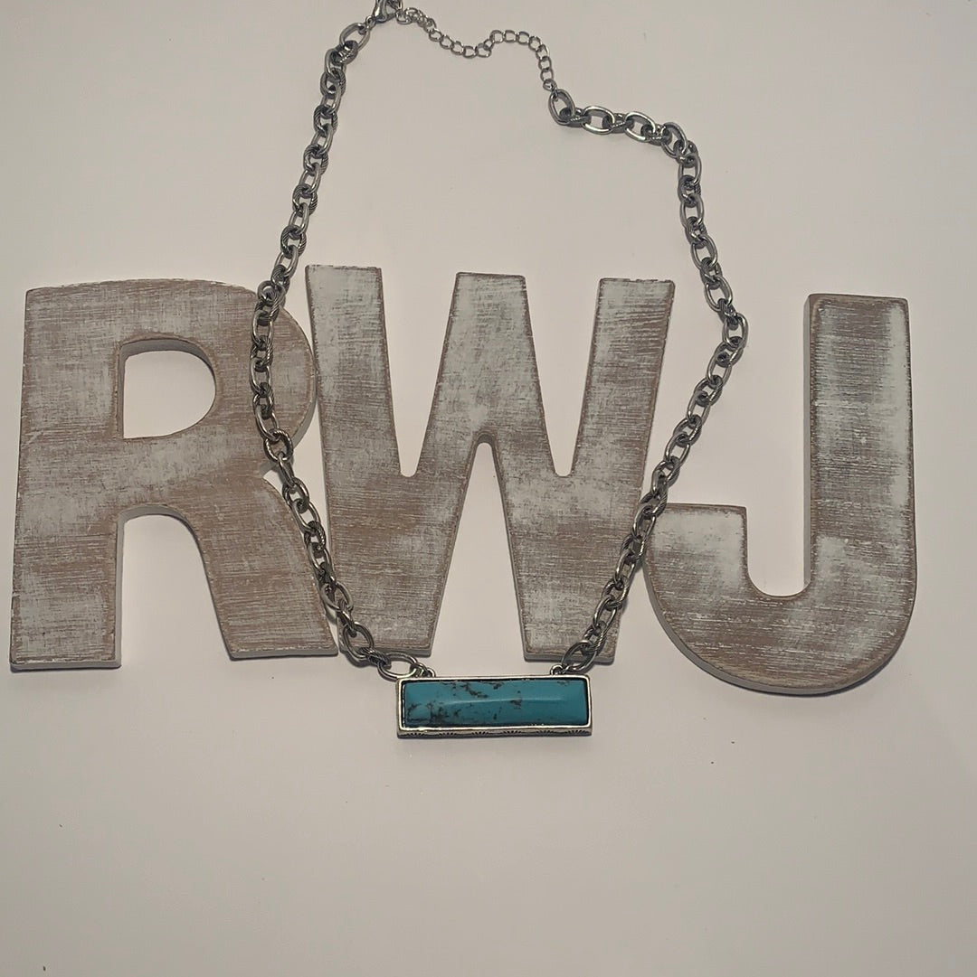 This rectangular turquoise stone has a thicker chain that is slightly more of a set are meant necklace but ideal for daily wear! It is on a 15 inch chain with a one inch extender.